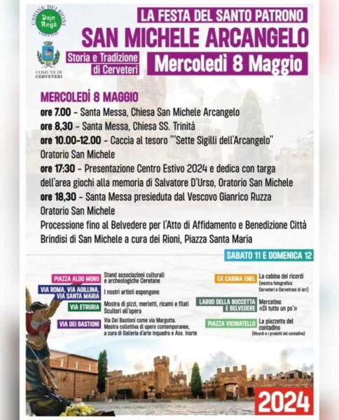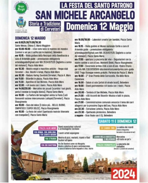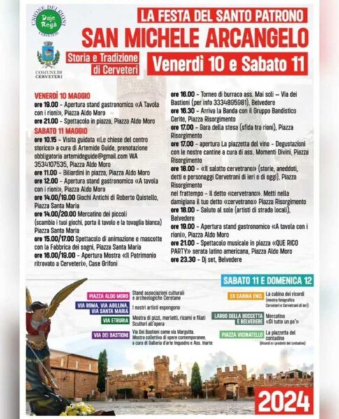 “Tradizione e storia si intrecciano in un programma ricco di eventi, dai festeggiamenti religiosi ai giochi popolari, dall’enogastronomia agli spettacoli dal vivo per grandi e piccoli. Musica, arte, mostre e artigianato animeranno le vie del centro storico, creando un’atmosfera festosa e coinvolgente. Cerveteri è pronta a festeggiare San Michele Arcangelo, il suo Santo Patrono, e lo fa con una grande festa. Cominceremo domani, mercoledì 8 maggio, con le consuete funzioni e processioni religiose, che si chiuderanno con l’atto di affidamento alla città, proseguendo poi nel weekend con gli appuntamenti nel Centro Storico organizzati insieme ai Rioni della Città. La Festa del Patrono è un’occasione imperdibile per immergersi nella bellezza e nella cultura di Cerveteri, per scoprire i suoi sapori tipici e per vivere un’esperienza autentica a contatto con la sua gente. Evviva San Michele, evviva Cerveteri!”.