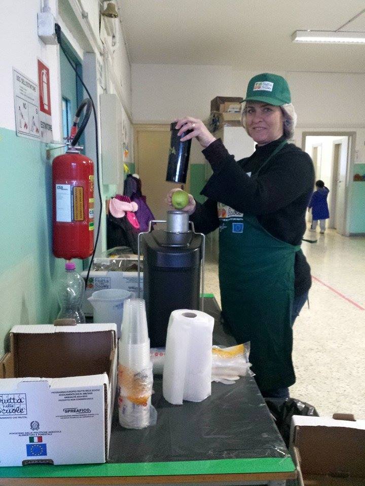 La variante di oggi nella scuola elementare di via Rapallo 3 , resa nota a mezzo facebook, è che oltre alla frutta fresca è stato allestito un bancone con tanto di centrifuga e frutta fresca e una signora addetta alla preparazione delle centrifughe. I bambini erano entusiasti e divertiti dalla novità.