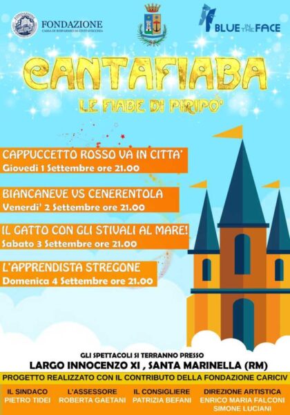 L’evento si svolgerà grazie al sindaco Pietro Tidei che ha sposato questo importante progetto, alla consigliera delegata al Patrimonio e alla Viabilità Patrizia Befani, all’assessora all’Urbanistica Roberta Gaetani e grazie al prezioso contributo della Fondazione Cassa di Risparmio di Civitavecchia presieduta da Gabriella Sarraco. Un ringraziamento in particolare all’Associazione Blue in the Face, alla compagnia teatrale di spessore ed alla Direzione artistica di Enrico Maria Falconi e Simone Luciani che accompagneranno lo spettatore in quattro serate, regalando una buonanotte speciale a tutti i bambini che potranno ascoltare fiabe rivisitate, interagendo con gli attori e con il mago Piripò, interpretato da Simone Luciani.