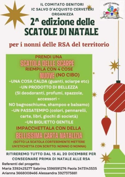 Un regalo per i nonni delle Rsa del territorio. Torna, con la sua seconda edizione, l’iniziativa “Scatole di Natale”, promossa dal Comitato Genitori della Salvo D’Acquisto di Cerveteri.