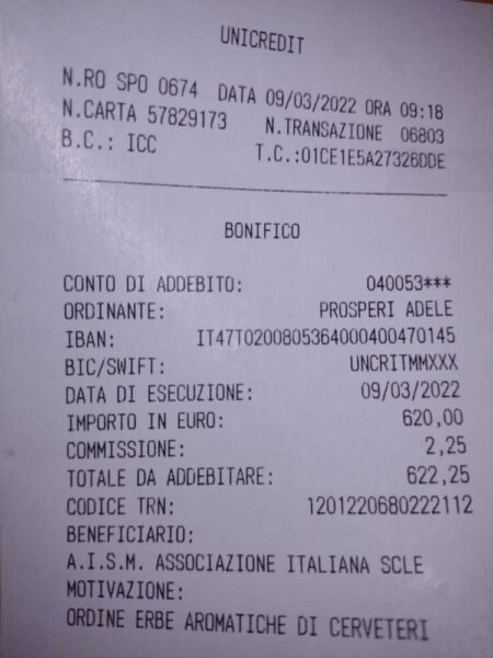 Una cifra importantissima quella maturata a Cerveteri, ben 620euro che nella giornata di oggi, mercoledì 9 marzo, i Volontari AISM di Cerveteri hanno provveduto ad inviare tramite bonifico all’AISM – Associazione Italiana Sclerosi Multipla.