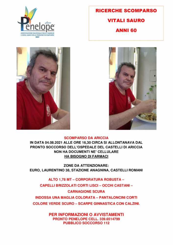 SCOMPARSO DA Ariccia Sauro Vitali.