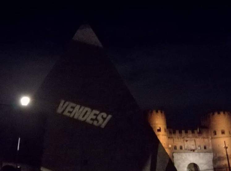 In una celebre scena del cinema italiano Totò riuscì a piazzare la Fontana di Trevi a un turista americano. Niente di tutto questo è avvenuto nella serata di ieri – 5 settembre – ma la curiosità ha invaso la rete. A Roma è stata proiettata la scritta “Vendesi” sulla Piramide Cestia, Tempio di Ercole, Tangenziale, Obelisco, Pantheon, Bocca la Verità.