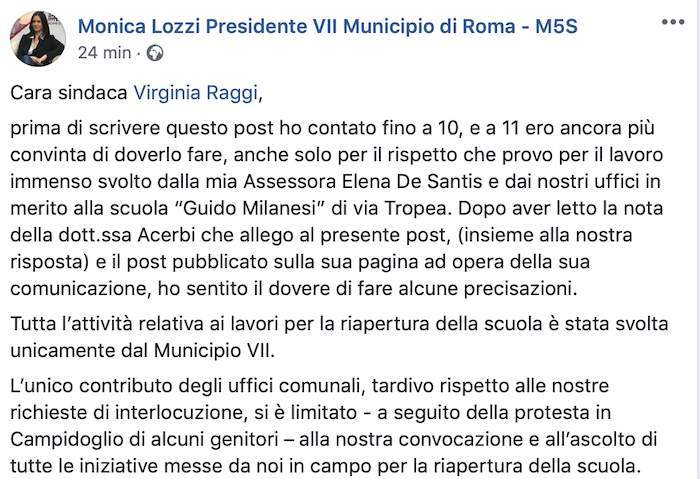 Ecco: quel “grazie all’intervento del Comune”, proviamo a interpretare, deve aver avuto l’effetto di un polpettone difficile da digerire. Così Lozzi ha usato la stessa arma del sindaco, un post su Facebook, per spiegare il lavoro effettuato: “Prima di scrivere questo post ho contato fino a 10, e a 11 ero ancora più convinta di doverlo fare, anche solo per il rispetto che provo per il lavoro immenso svolto dalla mia assessora Elena De Santis e dai nostri uffici in merito alla scuola “Guido Milanesi” di via Tropea. Dopo aver letto la nota della dottoressa Acerbi che allego al presente post, (insieme alla nostra risposta) e il post pubblicato sulla sua pagina ad opera della sua comunicazione, ho sentito il dovere di fare alcune precisazioni. Tutta l’attività relativa ai lavori per la riapertura della scuola è stata svolta unicamente dal Municipio VII”.