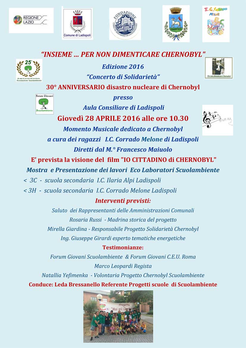 Ed è per questo che il 28 aprile 2016 a due giorni di distanza dal triste anniversario, Scuolambiente commemorerà questa vicenda con un “Concerto di Solidarietà” con i ragazzi dell’I.C. Corrado Melone diretti dal Maestro Maiuolo presso l’Aula Consiliare di Ladispoli dalle ore 10.30.
