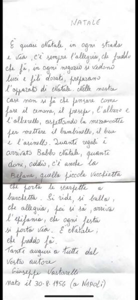 “Buon Natale a tutti da Giuseppe Vastarelli, ricoverato alla Casa della Salute di Ladispoli. Giuseppe, 67 anni di origine campane, porta sorrisi e gioia al PIT di Ladispoli da 7 lunghi mesi, e in questa occasione di festa ci tiene a fare gli auguri a tutta l’Italia e al Mondo con questa POESIA DI NATALE”.