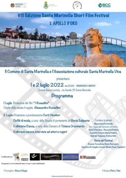 Il Sindaco Pietro Tidei e la consigliera delegata alle Pari Opportunità Maura Chegia annunciano il ritorno di uno degli appuntamenti fissi dell’estate, lo Short Film Festival, l’Apollo d’Oro alla sua VIII edizione ospitato nel cuore di Santa Marinella.