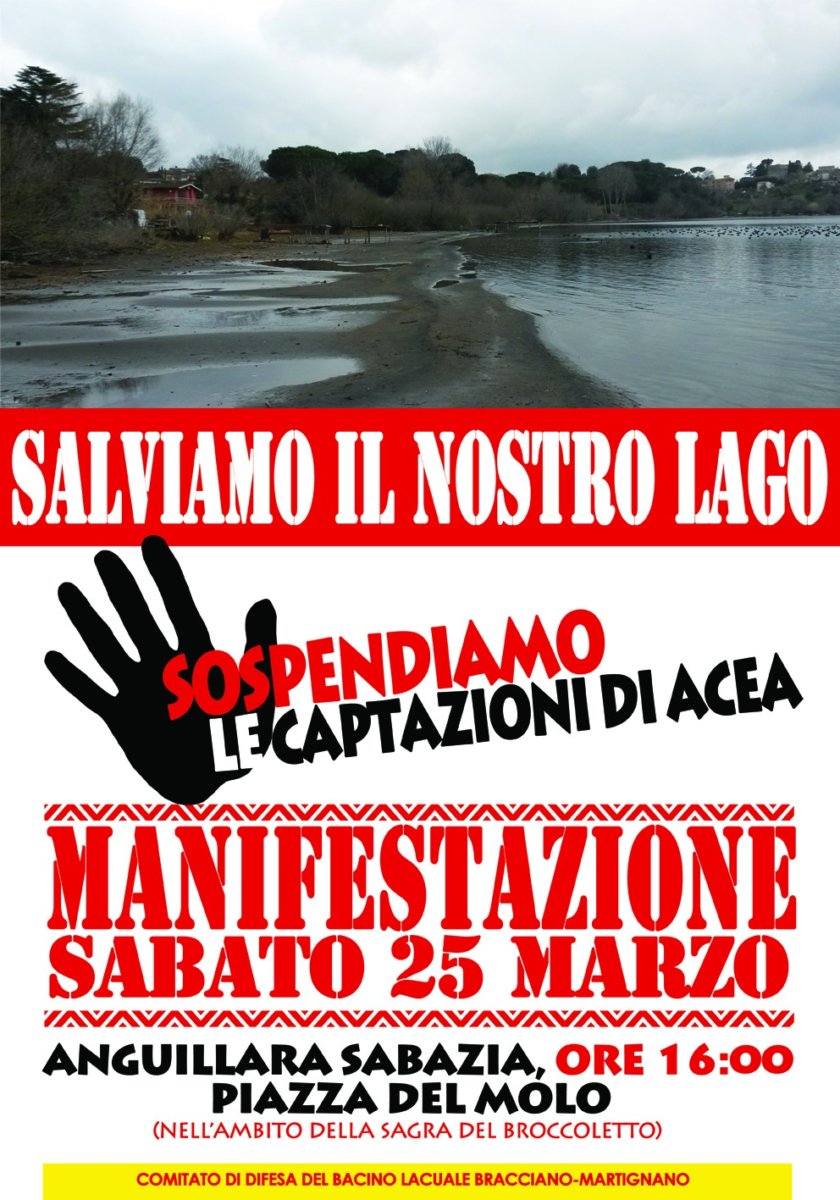 Riceviamo e pubblichiamo – “Salviamo il nostro lago”. Il Comitato di Difesa del Bacino Lacuale di Bracciano-Martignano scende in campo con iniziative forti mirate alla sospensione delle captazioni Acea dal lago di Bracciano, i cui livelli al minimo, mettono a rischio l’ecosistema. Sabato 25 marzo alle 16 nell’ambito della Festa del Broccoletto in piazzale del Molo ad Anguillara il comitato propone una manifestazione per presentare le azioni che intende portare avanti per trovare soluzioni di medio e lungo termine alla problematica che investe il territorio sabatino. Saranno presenti esponenti del Comitato, rappresentanti istituzionali, ed esperti.