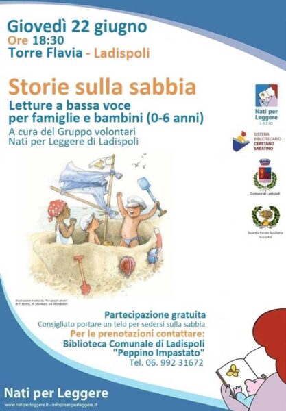 La Biblioteca, grazie al prezioso e attivissimo Gruppo Volontari Nati per Leggere di Ladispoli, vi porta fuori dalle sue mura ed organizza Storie sulla sabbia: letture a bassa voce per famiglie e bambini da 0 a 6 anni, giovedì 22 giugno alle ore 18:30 sulla spiaggia di Torre Flavia.