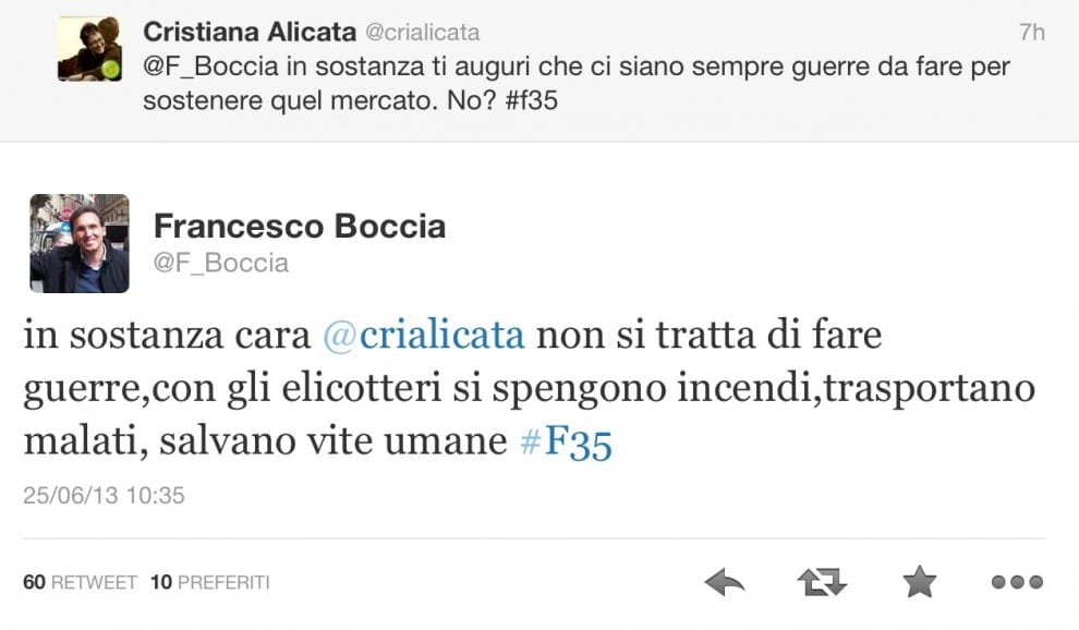 Ormai è effetto virale per il tweet di Francesco Boccia (Pd) presidente della commissione Bilancio alla Camera, che oggi, dal suo account rispondendo ad un tweet appoggiava l’opportunità di acquistare caccia F35 scambiandoli per elicotteri. Nel tweet in questione Boccia ha scritto «In sostanza non si tratta di fare guerre, con gli elicotteri si spengono incendi, trasportano malati, salvano vite umane #F35».