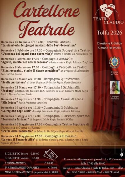 E’ stato reso noto il cartellone della stagione 2026 del teatro Claudio di Tolfa, la cui programmazione comincerà il 25 gennaio. E arriverà fino a maggio, con spettacoli sempre di domenica, in pomeridiana. Già avviata la campagna abbonamenti, che prevede varie offerte anche per famiglie.