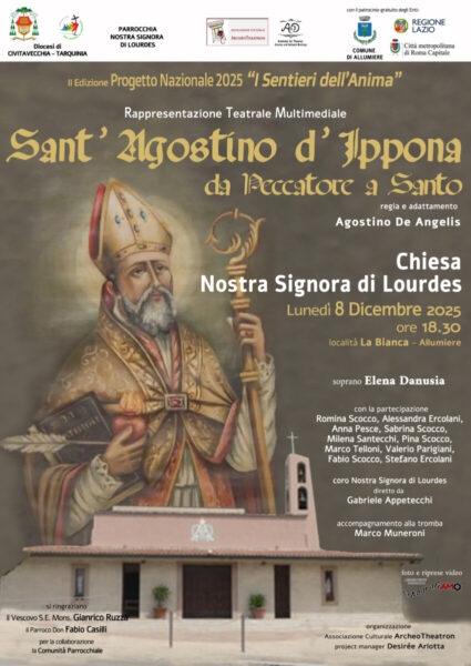 Dopo il successo riscosso lo scorso agosto presso l’Eremo della SS. Trinità di Allumiere, torna in scena la Rappresentazione Teatrale Multimediale dedicata a Sant’Agostino d’Ippona, con la regia di Agostino De Angelis, in una nuova e suggestiva cornice. L’appuntamento “Sant’Agostino d’Ippona: da Peccatore a Santo” è fissato per l’8 dicembre alle ore 18.30 nella Chiesa Nostra Signora di Lourdes nella località La Bianca del Comune di Allumiere, un luogo che, con la sua spiritualità, si presta alla narrazione intensa e contemplativa della vita del grande Dottore della Chiesa.