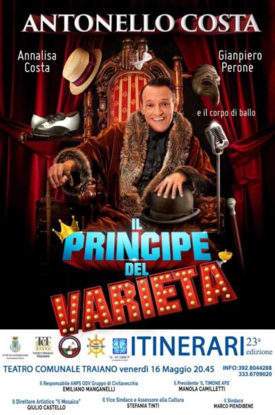 Al Traiano arriva lo spettacolo di Antonello Costa “Il Principe del Varietà” ospite con tutto il suo cast della 23^ edizione di Itinerari organizzata da Il Mosaico un Popolo di Artisti per la direzione artistica di Giulio Castello. La rassegna 2025 sarà a favore dell’ANPS ODV (i volontari della Polizia di Stato di Civitavecchia) ed Il Timone APS sempre di Civitavecchia.