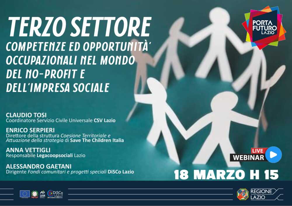 Si tiene il 18 marzo un evento on line organizzato da Porta Futuro Lazio sulle tematiche relative le ricadute occupazionali nel mondo del no-profit e dell’impresa sociale, dal titolo “Terzo Settore. Competenze ed opportunità occupazionali nel mondo del no-profit e dell’impresa sociale”.
