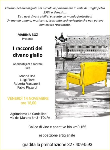 “C’erano dei divani gialli nel piccolo appartamento in calle del Tagliapetra 2584 a Venezia… E su quei divani gialli si è seduto un mondo fantastico! Un mondo umano, musicante, teatrante così variegato che non poteva non essere raccontato” così si presenta l’evento nella locandina.