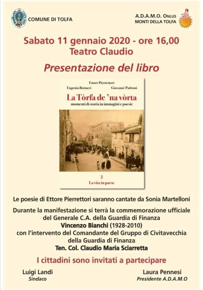 Un tuffo nei ricordi a Tolfa, il pomeriggio di sabato 11 gennaio. Alle 16, infatti, il teatro Claudio accoglie la presentazione del libro “La Tòrfa de ’na vòrta”, scritto da Eugenio Bottacci, Ettore Pierrettori e Giovanni Padroni. Le poesie di Pierrettori saranno cantate da Sonia Martelloni.