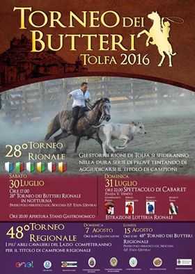 Procedono spediti i preparativi per l’organizzazione del Torneo dei Butteri 2016, che spegne le sue 28 candeline per l’edizione rionale e addirittura 48 per quella Regionale. A coordinare tutte le attività è lo staff della Pro Loco, guidata dal Presidente Alessio Testa insieme a Stefania Marcelli e Silvia Marazzi con la collaborazione del Comune di Tolfa e del Sindaco Luigi Landi. Il programma per la prima volta nella storia prevede una grande novità: il gioco finale infatti sarà disputato in notturna. Il Torneo prenderà infatti il via alle 17 di sabato 30 luglio presso il Polo Fieristico di loc. La Nocchia. I rioni storici cittadini si contenderanno il punteggio dei giochi dell’anello e del cappello, per poi incontrarsi dopo il calare del sole con la gara spettacolare della presa del vitello che decreterà il vincitore. A disposizione degli spettatori degustazioni enogastronomiche in loco. Si prevede un torneo molto combattuto: Cappuccini, Lizzera, Poggiarello, Rocca e Sughera hanno infatti organizzato squadre molto forti.