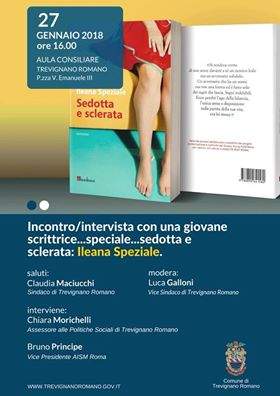 Sabato 27 gennaio, ore 16, a Trevignano Romano presso la Sala Consiliare l’Amministrazione Comunale ospita l’appuntamento con una “strana patologia” e con chi la vive in “leggerezza” scrivendo per incoraggiare e trasmettere messaggi positivi. Ileana Speziale racconta il suo libro “sedotta e sclerata” invitata e intervistata dal Vice Sindaco di Trevignano Luca Galloni. Intervengono durante l’iniziativa il Sindaco di Trevignano Claudia Maciucchi, l’Assessore alle Politiche Sociali Chiara Morichelli e il Vice Presidente dell’Associazione Sclerosi Multipla di Roma Bruno Principe.