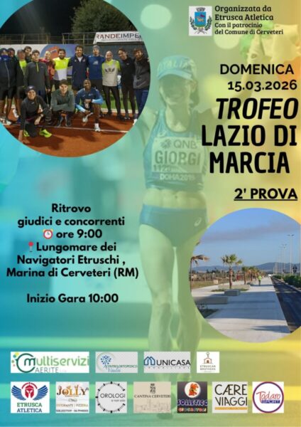Domenica 15 marzo l’atletica “si prende” il Lungomare dei Navigatori Etruschi a Campo di Mare. Prenderà infatti il via alle ore 10:00 la seconda prova del “Trofeo Lazio di Marcia”, organizzato dall’Etrusca Atletica e patrocinato dall’Assessorato allo Sport del Comune di Cerveteri. Il ritrovo per giudici e concorrenti è fissato alle ore 09:00.
