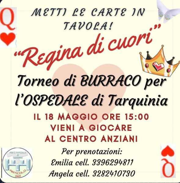 Stavolta il cuore dei Tarquiniesi darà vita al Torneo di Burraco “Regina di Cuori”, che si svolgerà sabato 18 maggio alle ore 15 presso il Centro Anziani. Le somme versate per iscriversi alla gara, che vedrà in campo 50 coppie di giocatori, e le somme derivate dalla sottoscrizione volontaria a cui potrà aderire chiunque, saranno destinate per acquistare una poltrona tecnica speciale per la somministrazione della chemioterapia, da donare all’ambulatorio oncologico del nostro Ospedale, un vero gioiello sanitario diretto dal Dott. Signorelli, coadiuvato da personale infermieristico che sa unire, come sanno fare gli operatori della nostra struttura sanitaria, competenza e cura amorevole per assistere i malati che affrontano il male dei mali.