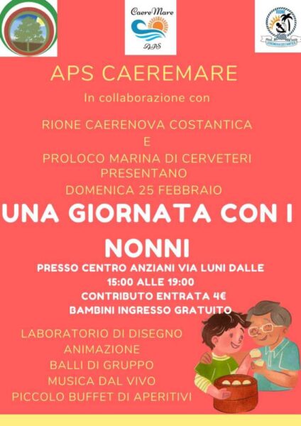 Domenica 25 febbraio a partire dalle ore 15:00, la APS CaereMare, in collaborazione con Rione Caerenova Costantica e ProLoco Marina di Cerveteri presentano “Una giornata con i nonni”, un pomeriggio conviviale, con laboratori di disegno, animazione, balli di gruppo, musica dal vivo e un piacevole buffet.