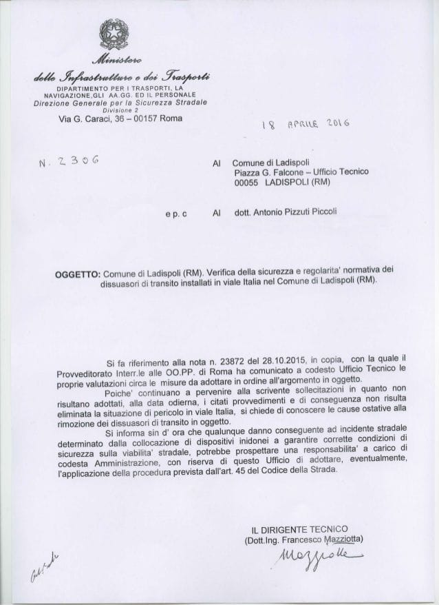 Diversa sembrerebbe l’interpretazione del dirigente tecnico della seconda divisione della Direzione Generale per la Sicurezza Stradale che nella lettera datata 18 aprile 2016 prosegue: “Si informa sin d’ora che qualunque danno conseguente ad incidente stradale determinato dalla collocazione di dispositivi inidonei a garantire corrette condizioni di sicurezza sulla viabilità stradale, potrebbe prospettare una responsabilità a carico di codesta Amministrazione, con riserva di questo Ufficio di adottare, eventualmente, l’applicazione della procedura prevista dall’art 45 del Codice della Strada”.