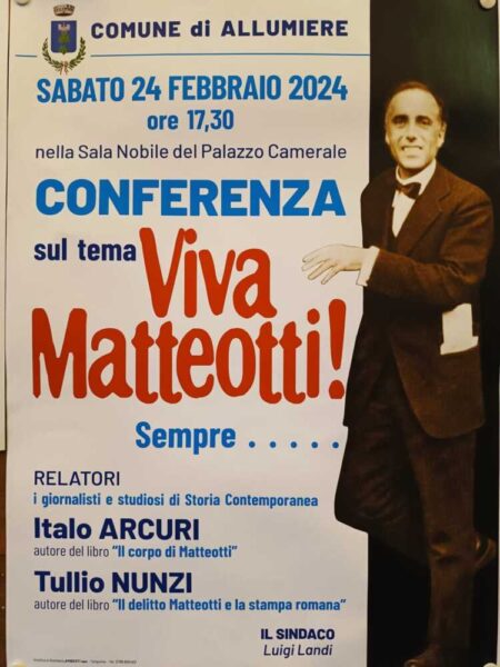 Il Comune di Allumiere: “Nel centenario del suo assassinio (1924-2024) si sente il dovere di ricordare un uomo assunto con il suo martirio a simbolo della civile libertà e invita tutta la cittadinanza a prendere parte a questo primo evento nazionale nel nostro Palazzo della Reverenda Camera Apostolica (Sala Nobile) il giorno 24 Febbraio alle ore 17.30”, si legge sui social istituzionali del Comune.